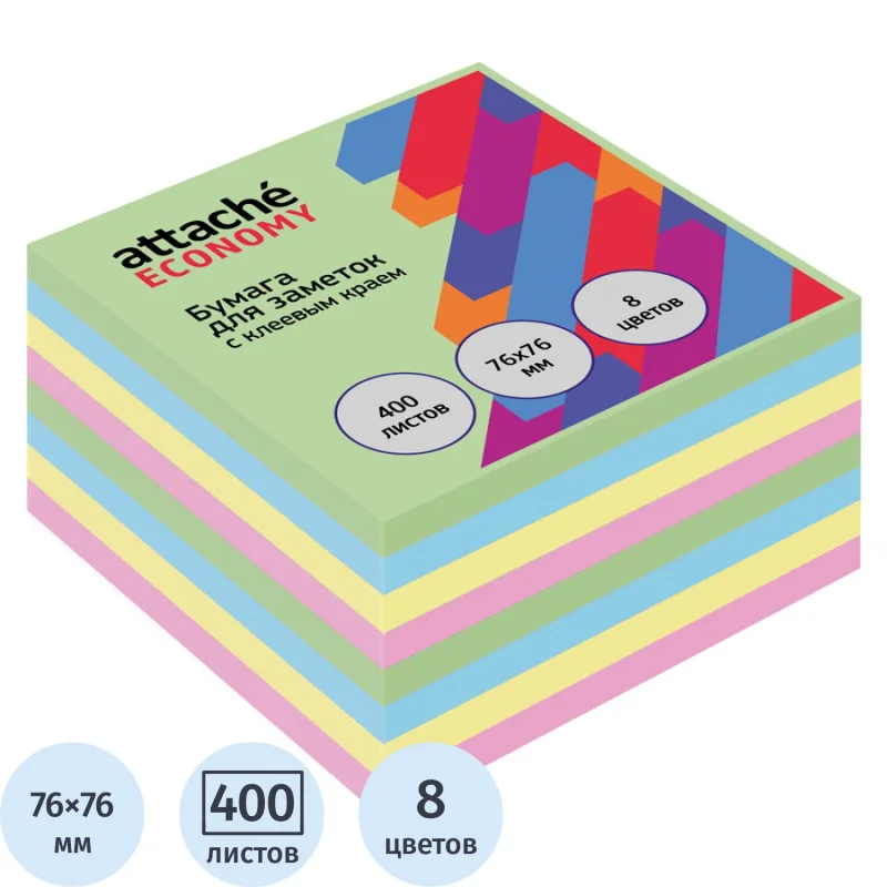 Бумага для заметок с клеевым краем Economy 76х76 мм, 400 л, 8 цв в асс. Стикеры Attache Economy подходят для использования в офисе...