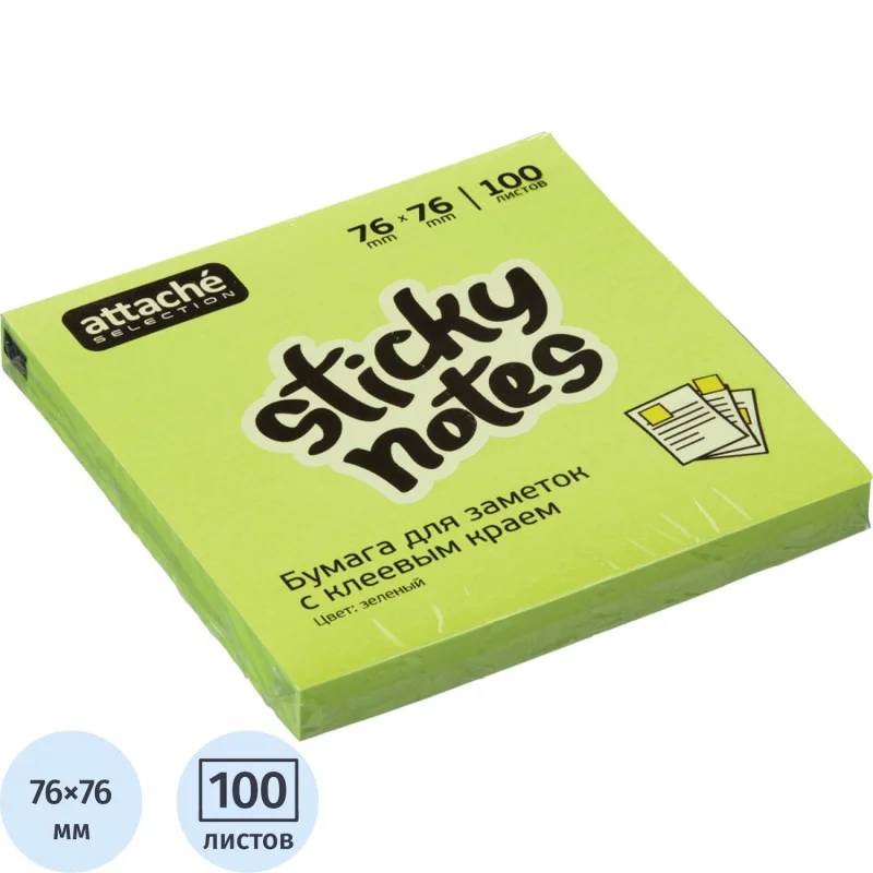 Стикеры Attache Selection в формате 76x76 мм, зеленого цвета, поставляются в упаковке из 100 листов. Тон стикеров - неоновый. Плот...