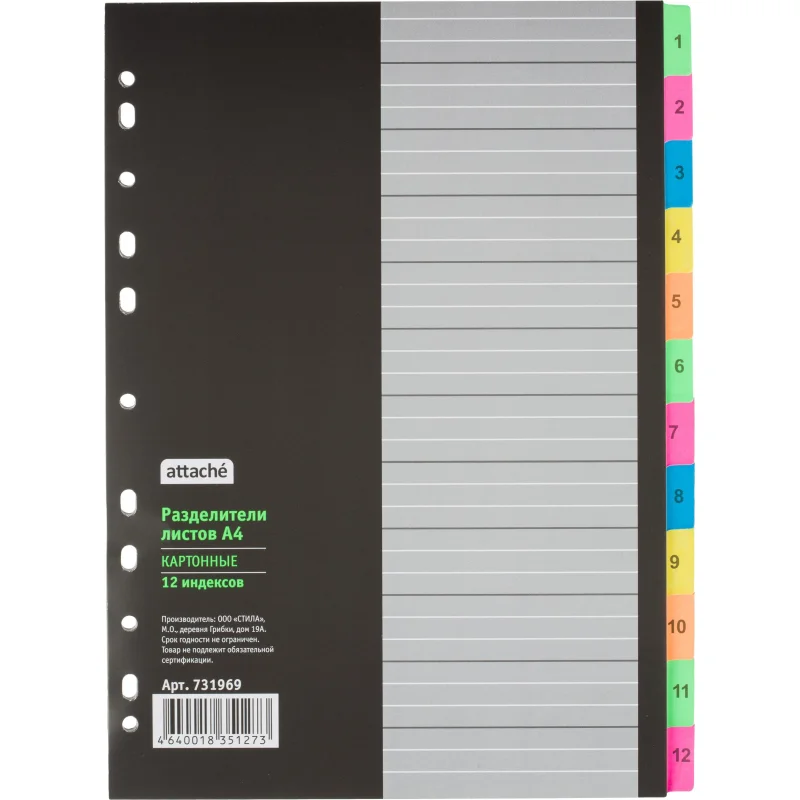 Разделитель листов с индексами Attache , А4,цифровой 1-12 , картон