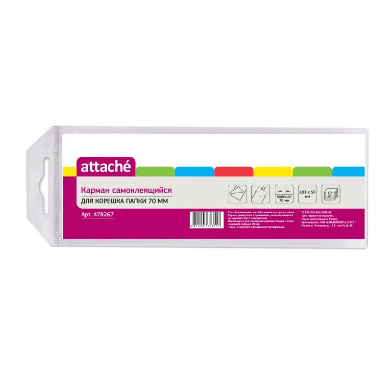 Самоклеящиеся карманы Attache корешок папки 70 мм,191х50 мм,10 шт
