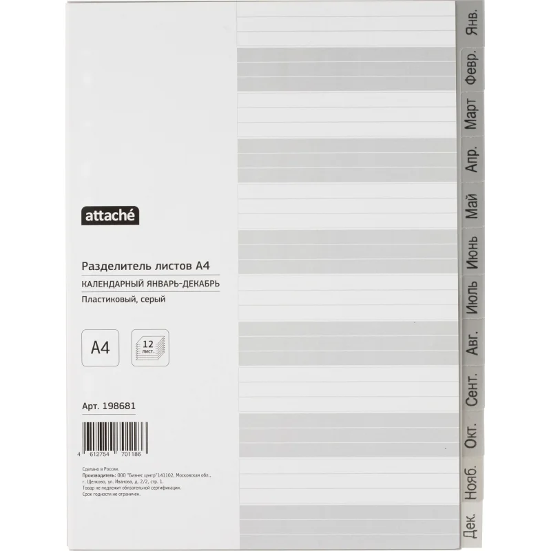 Разделитель листов из сер.пласт. Attache, А4, 12 разделов, янв-декабрь