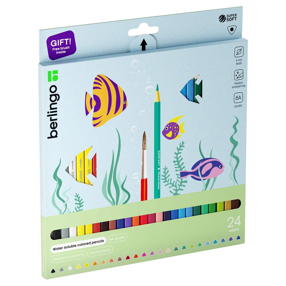Карандаши акварельные Berlingo 'SuperSoft. Рыбки', 24цв.+кисть, трехгран., заточен., картон, европод