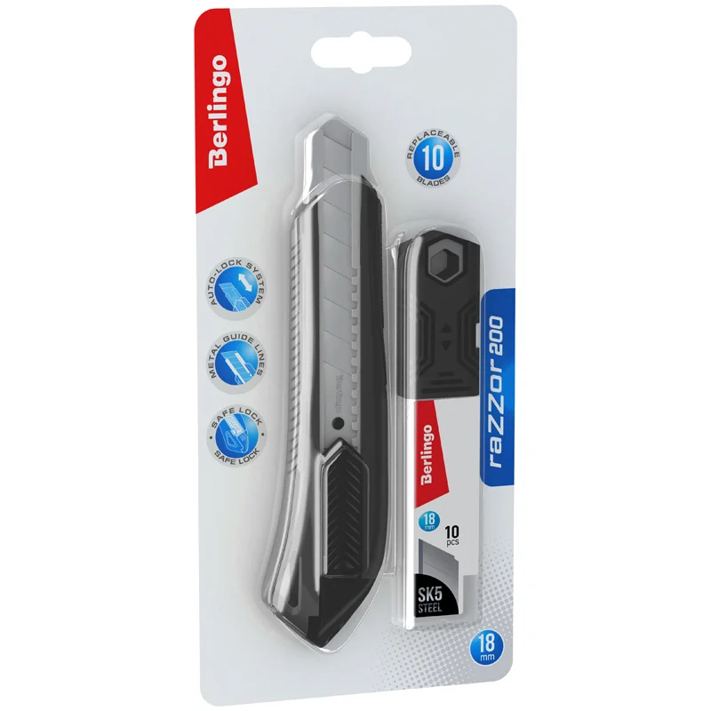 Нож канцелярский 18мм Berlingo 'Razzor 200', серый + лезвия сменные 10шт., блистер, европодвес