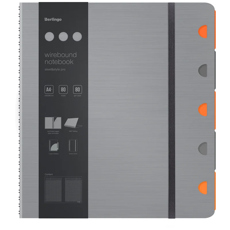 Бизнес-тетрадь А4+, 80л., Berlingo 'Steel&Style Pro', клетка, на гребне, 80г/м2, перфорация, раздели