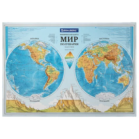 Карта мира физическая 'Полушария' 101х69 см, 1:37М, интерактивная, в тубусе, BRAUBERG, 112376