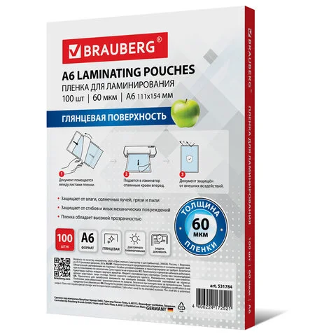 Пленки-заготовки для ламинирования МАЛОГО ФОРМАТА, А6, КОМПЛЕКТ 100 шт., 60 мкм, BRAUBERG, 531784