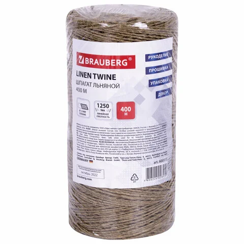 Шпагат льняной банковский, диаметр 1,5 мм, длина 400 м, линейная плотность 1250 текс, BRAUBERG, 6001