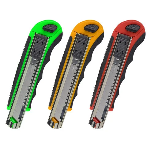 Нож снабжен автоматическим фиксатором лезвия шириной 18 мм. Края инструмента резиновые, предотвращают скольжение руки при работе. ...