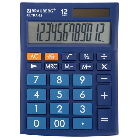 Калькулятор настольный BRAUBERG ULTRA-12-BU (192x143 мм), 12 разрядов, двойное питание, СИНИЙ, 25049