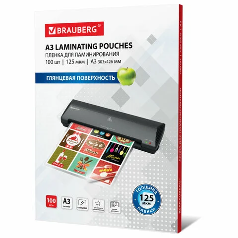 Пленки-заготовки для ламинирования БОЛЬШОГО ФОРМАТА, А3, КОМПЛЕКТ 100 шт., 125 мкм, BRAUBERG, 530799