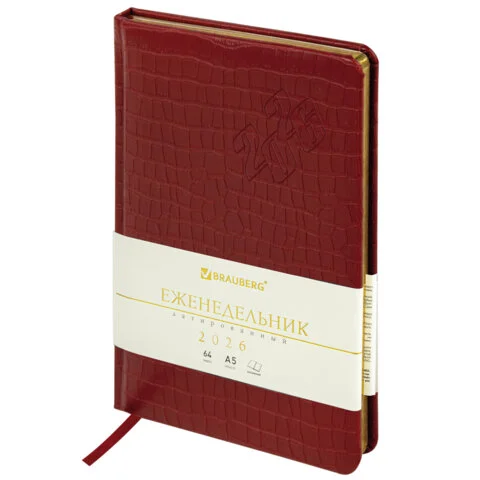 Еженедельник датированный 2026 А5 145х215 мм, BRAUBERG 'Augustus', под кожу, красный, 117160