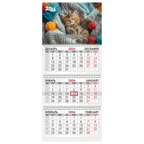 Календарь квартальный на 2026 г., 3 блока, 3 гребня, бегунок, мелованная бумага, BRAUBERG, 'Котенок'