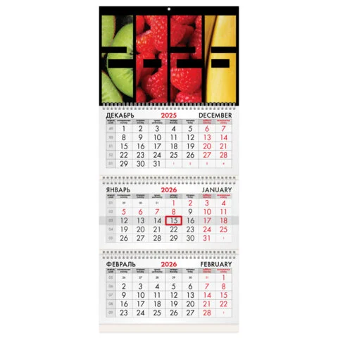 Календарь квартальный на 2026 г., 3 блока, 3 гребня, бегунок, офсет, BRAUBERG, 'Фрукты', 116775