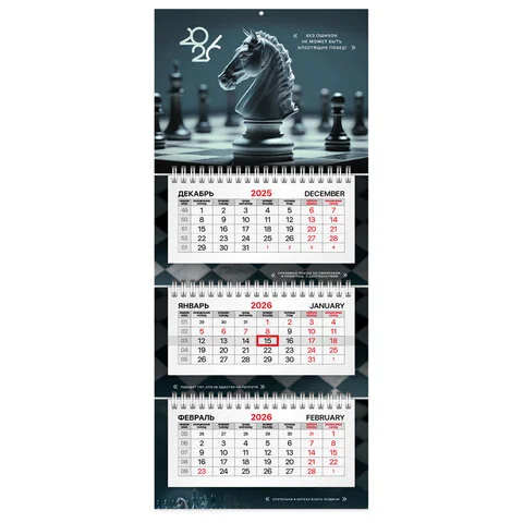 Календарь квартальный 2026 г., 3 блока, 3 гребня, бегунок, офсет, BRAUBERG EXTRA MINI, 'Ход конем'