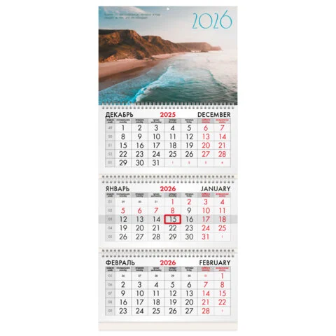 Офисный календарь на 2026 год на 3-х гребнях. Для удобства планирования состоит из 3-х блоков с календарными сетками на три месяца...