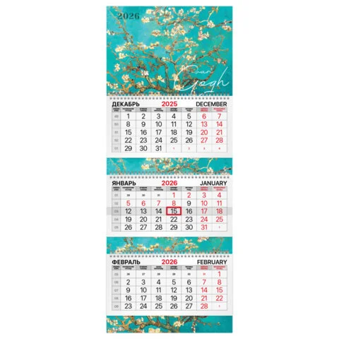 Офисный календарь на 2026 год на 3 гребнях. Для удобства планирования состоит из 3 блоков с календарными сетками на три месяца – п...