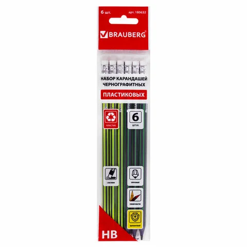 Карандаши чернографитные BRAUBERG НАБОР 6 шт., 'Jet', НВ, с резинкой, пластиковые, корпус ассорти, з
