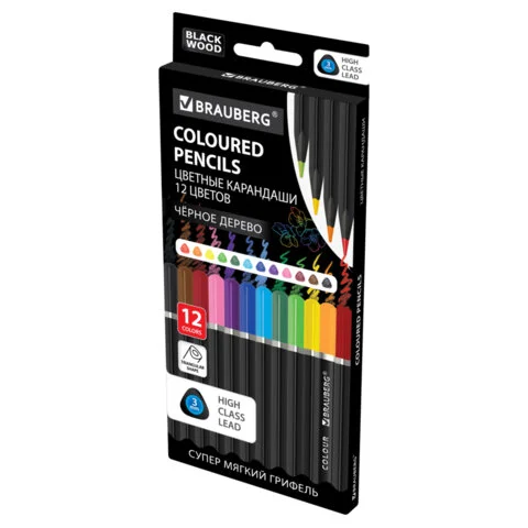 Карандаши цветные чёрное дерево BRAUBERG BLACK WOOD, 12 цветов, трехгранные, мягкий грифель 3 мм, 18