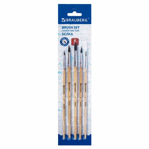 Кисти BRAUBERG, набор 5 шт. (белка, круглые № 1, 2, 3, 4, 5), блистер, 200217