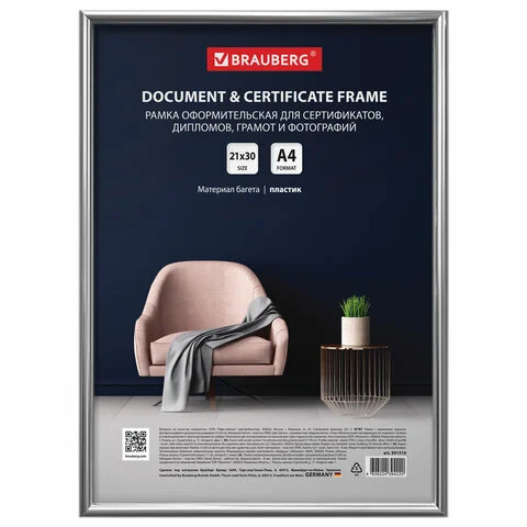 Рамка формата А4 (21х30 см) выполнена из ПВХ серебристого цвета, что позволяет ей гармонично вписаться как в домашний, так и в дел...