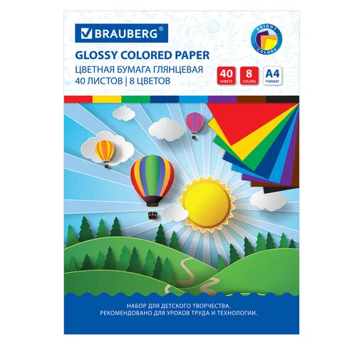 Цветная бумага А4 мелованная (глянцевая), 40 листов 8 цветов, на скобе, BRAUBERG, 200х280 мм, 128004