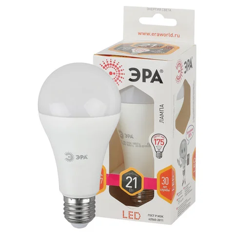 Лампа светодиодная ЭРА STD, 21 (175) Вт, цоколь E27, груша, теплый белый свет, 25000 ч., LED A65-21W