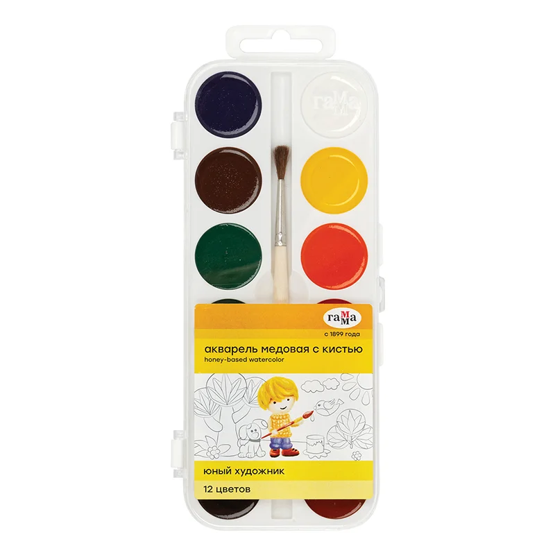 Акварель Гамма 'Юный художник', медовая, 12 цветов, с кистью, пластик. упак., европодвес