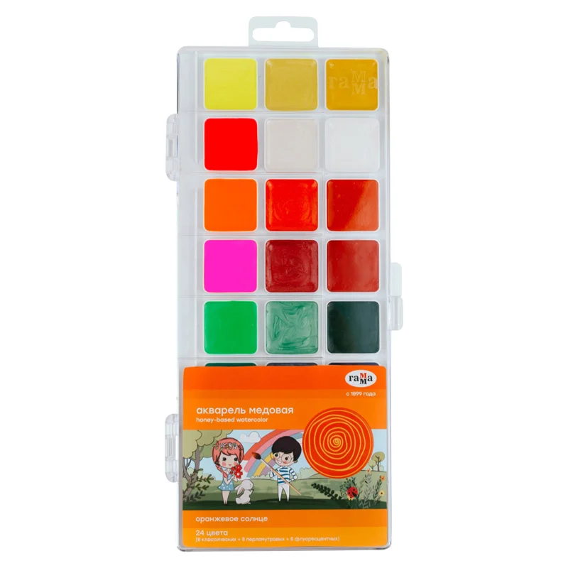Акварель Гамма 'Оранжевое солнце', медовая, 24 цветов (8 перламутр.+ 8 флуор.+ 8 классич.), без кист