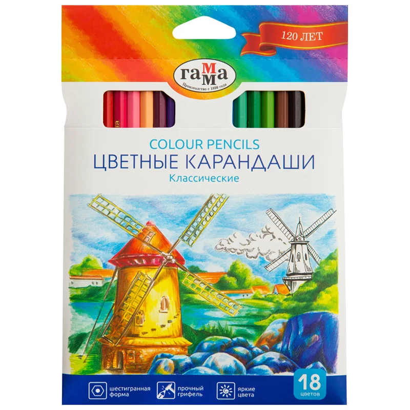Карандаши цветные Гамма 'Классические', 18цв., заточен., картон. упаковка, европодвес