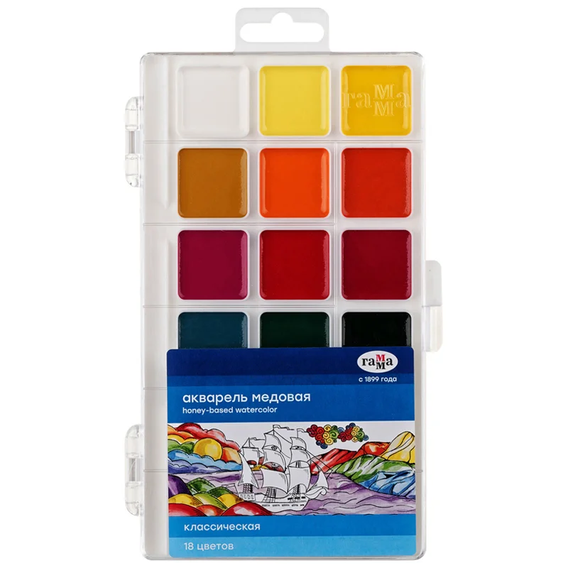 Краски акварельные ГАММА 'Классическая', 18 цветов, медовая, пластиковый корпус, европодвес, 1009196