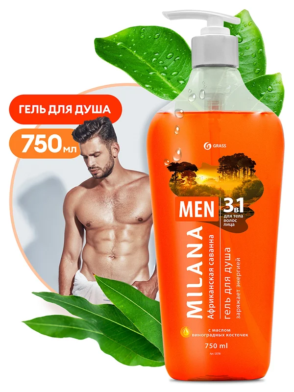 Гель для душа Grass Milana Men Африканская саванна, 750мл, с маслом виноградной косточки