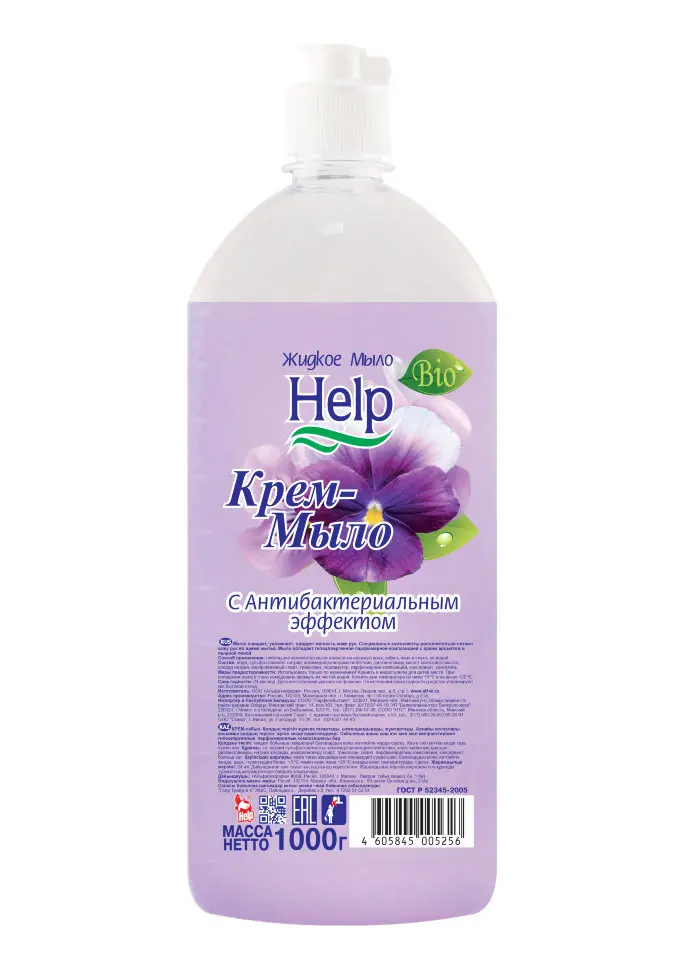 Жидкое мыло с дозатором Help 1л, с антибактериальным эффектом, крем