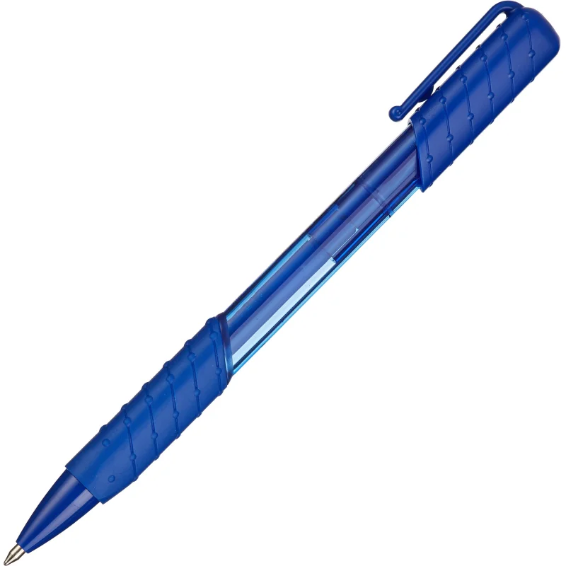 Шариковая ручка компании Kores синего цвета. Трехгранный корпус и резиновая манжетка комфортны для рук. Шарик в трубочке стержня ...