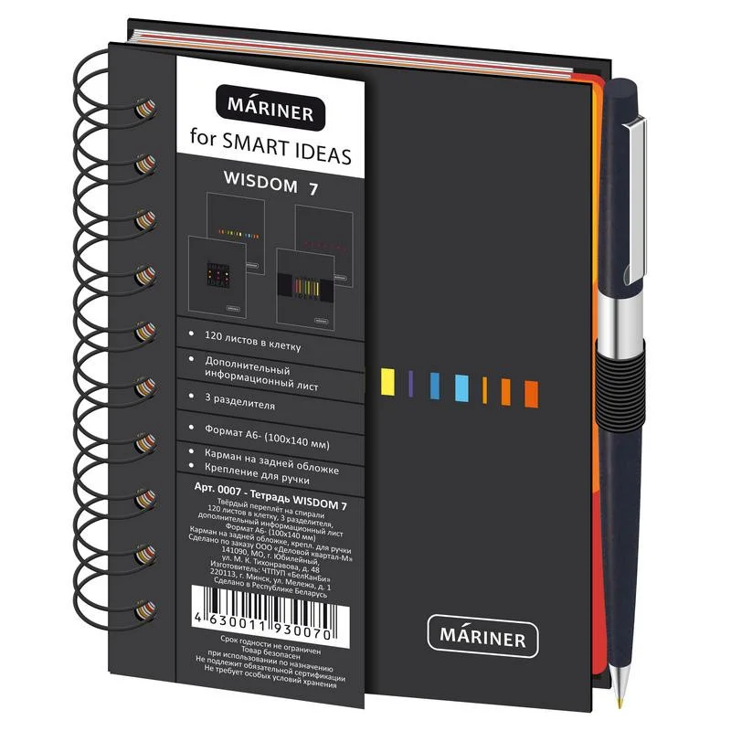 Бизнес-тетрадь Mariner Wisdom 7 формата А6 предназначена для ведения рабочих записей, планирования и систематизации...