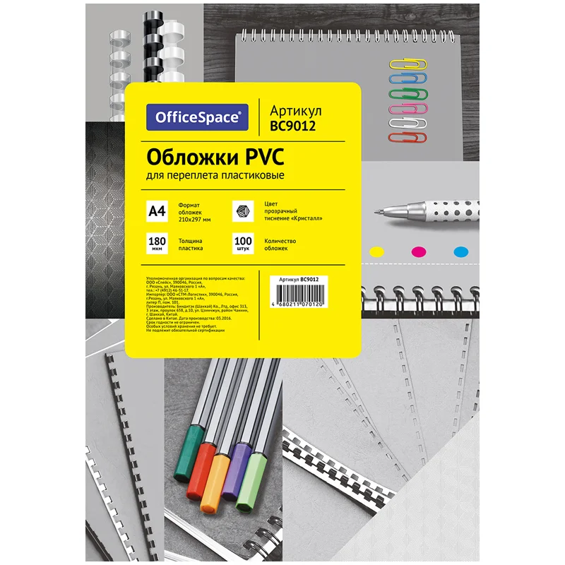 Обложка А4 OfficeSpace 'PVC' 180мкм, 'Кристалл' прозрачный пластик, 100л.