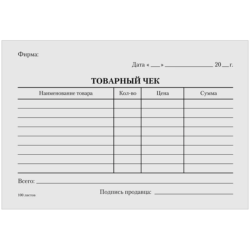 Бланк 'Товарный чек'. Бланки изготовлены из газетной бумаги и склеены в книгу по 100 листов. Индивидуальная упаковка в термоусадоч...