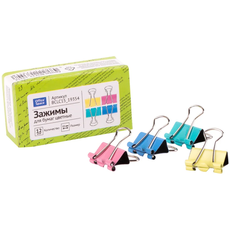 Зажимы для бумаг 15мм, OfficeSpace, 12шт., цветные, картонная коробка