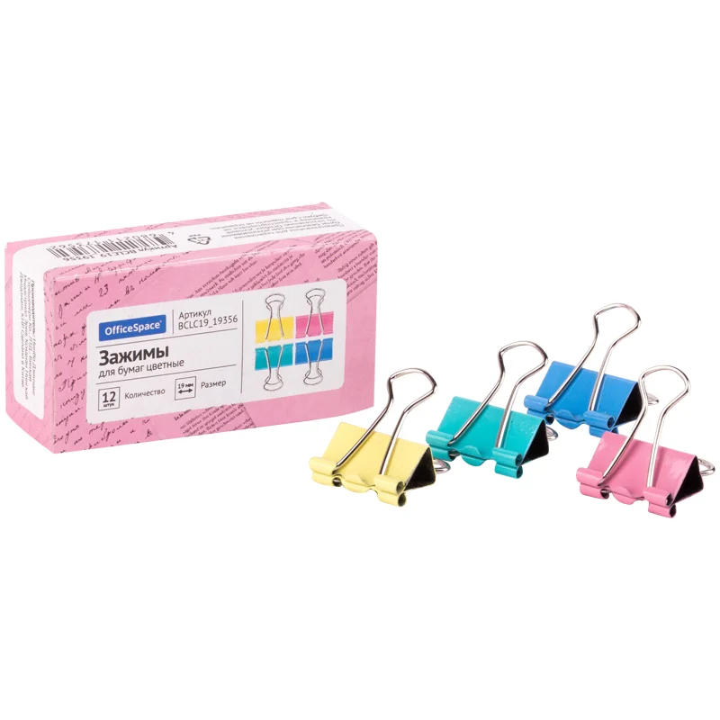 Зажимы для бумаг 19мм, OfficeSpace, 12шт., цветные, картонная коробка