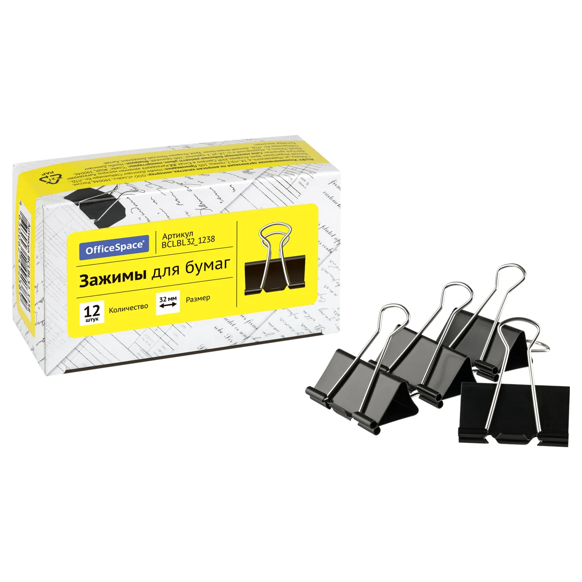 Зажимы для бумаг 32мм, OfficeSpace, 12шт., черные, картонная коробка