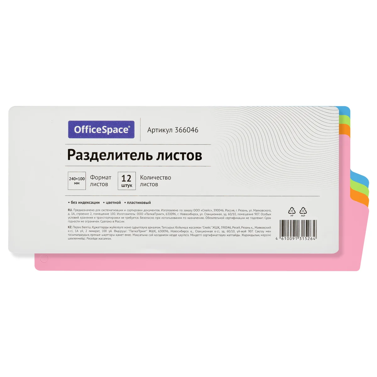 Разделитель листов OfficeSpace 240*100мм, 12 листов, без индексации, цветной, пластиковый