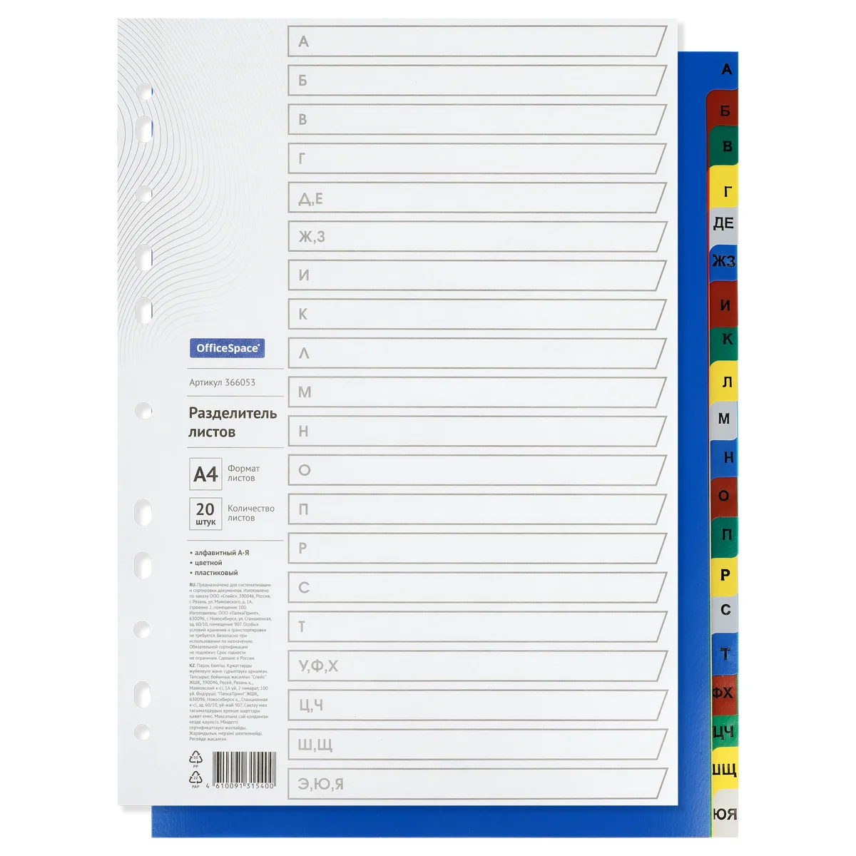 Разделитель листов OfficeSpace А4, 20 листов, алфавитный А-Я, цветной, пластиковый