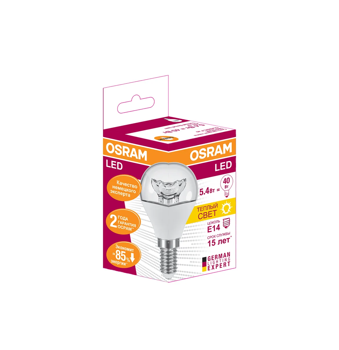 Лампа светодиодная Osram 5.4Вт, Е14 , 3000К, теплый белый свет, прозрачная, шар
