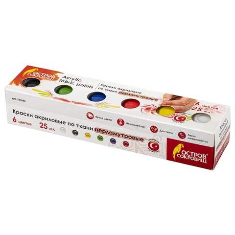 Краски акриловые по ткани ПЕРЛАМУТРОВЫЕ ОСТРОВ СОКРОВИЩ 6 цветов по 25 мл, 191695