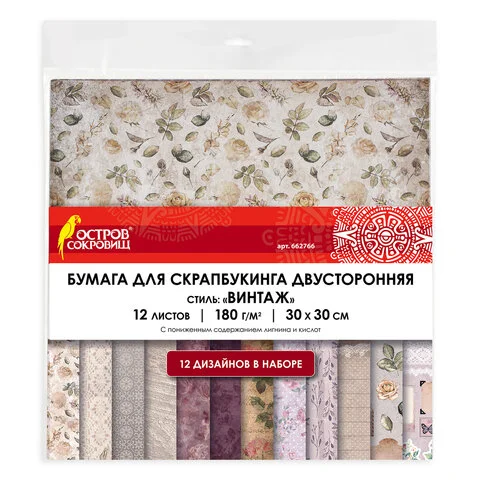 Бумага для скрапбукинга 30х30 см 'Винтаж', двусторонняя, 12 листов, 12 дизайнов, 180 г/м2, ОСТРОВ СО