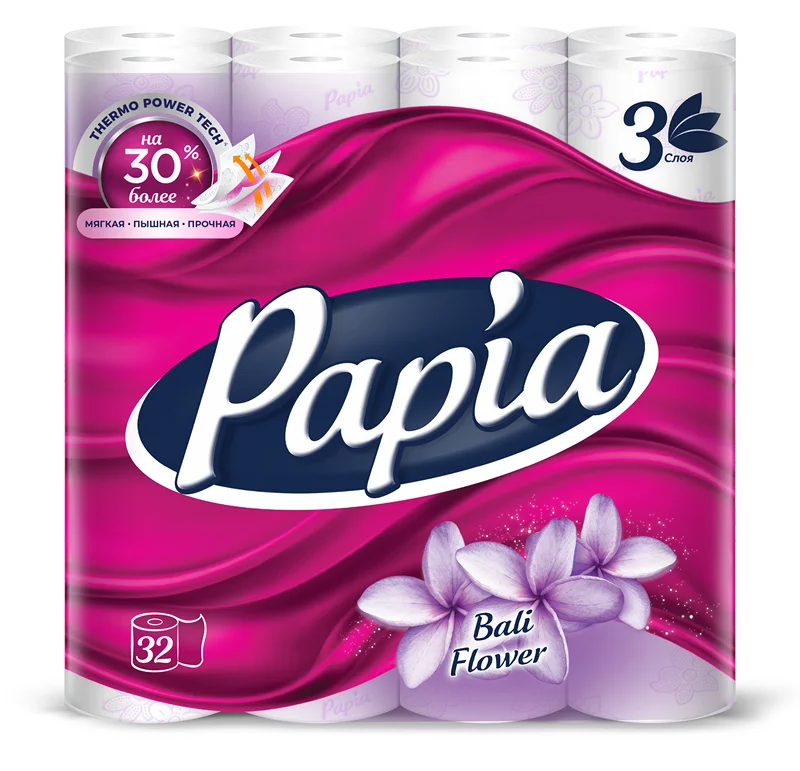 Ароматизированная трехслойная туалетная бумага Papia 'Балийский цветок' с цветным тиснением и перфорацией. 'Балийский цветок' – не...