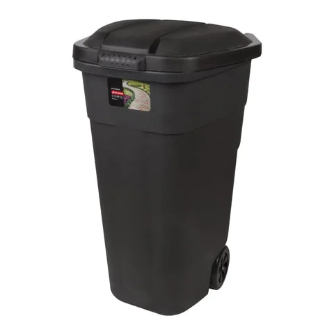 Контейнер-бак мусорный 110 л на колесах с крышкой выполнен из пластика черного и серого цвета. Размеры изделия: 84x55x54.5 см. Вес...