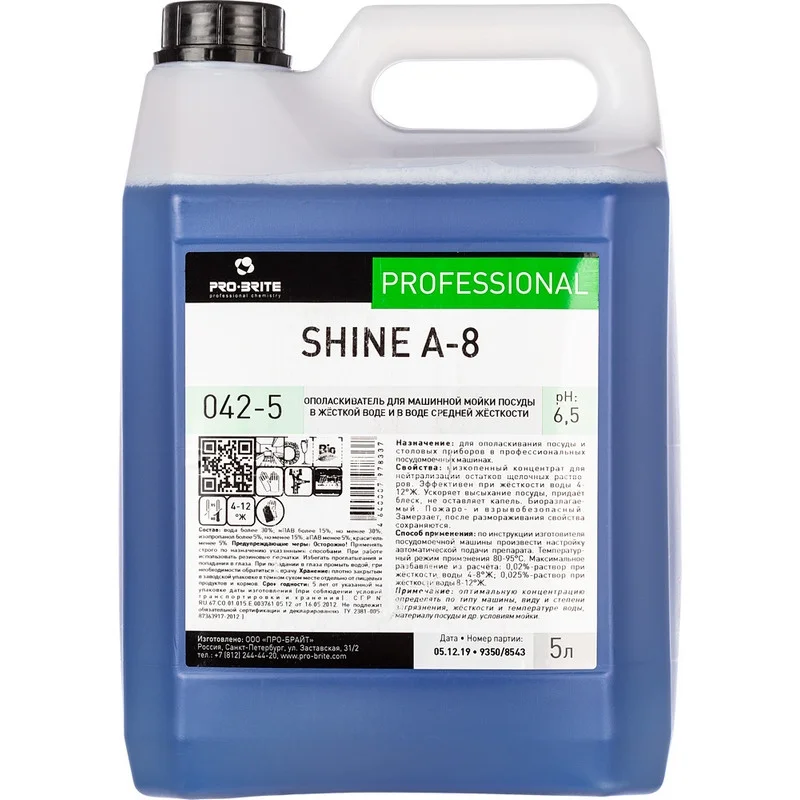 Ополаскиватель для посудомоечных машин 5 л, PRO-BRITE SHINE А-8, концентрат, 78337, 042-5
