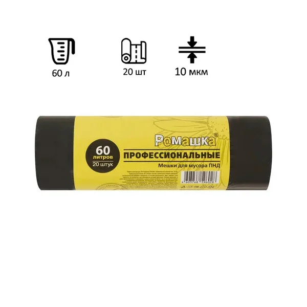 Мешки для мусора 60 л, черные, в рулоне 20 шт, ПНД 10 мкм, 58x68 см, РОМАШКА ПРОФИ ПФ-60/20/30