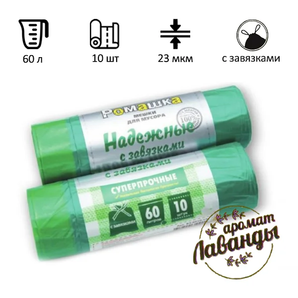 Мешки для мусора Ромашка Надежные с завязками 60л, ПСД, 59х64см, 23мкм, 10шт, зеленые, в рулоне