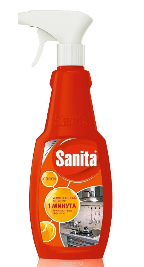 САНИТА Спрей 500мл 1 МИНУТА для кухонных поверхностей.Состав: б. 5%, но < 15% растворитель, < 5% НПАВ, < 5% :АПАВ, d-лимонен, соль...